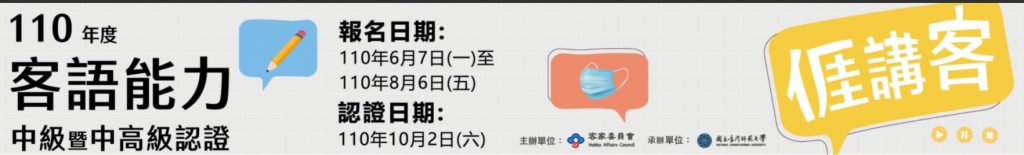 「110年度客語能力中級暨中高級認證」自即日起至8月6日(星期五)開放報名。本年度將於10月2日(星期六)舉辦認證。報名資格不限,亦毋須先通過初級認證,19歲以下考生報名費全免!為提升考生應試便利性,今年特別增設基隆試場,鼓勵民眾多加參與。