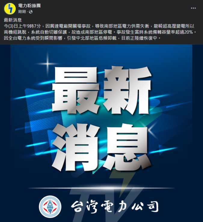 台電指出,今(3)日上午9時7分,因興達電廠開關場事故,導致南部地區電力供需失衡,龍崎超高壓變電所以南機組跳脫,系統自動切離保護,故造成南部地區停電。事故發生當時系統備轉容量率達24.61%。因全台電力系統受到瞬間影響,引發中北部地區低頻卸載,導致中北部部分地區用戶停電。