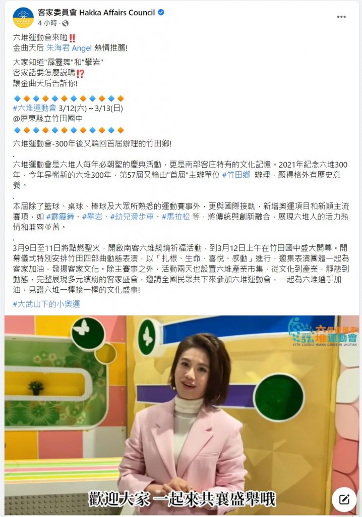 金曲天后朱海君以臉書貼文及影片大秀客語,邀大家共襄盛舉。朱海君說,這次的比賽有霹靂舞、攀岩,18種的運動賽事,12號13號安排近60攤的客家特色美食市集,「#歡迎您帶著勇敢活力前往打擂台」、「#邀請您帶上空空的肚子來到現場讓我們用特色美食餵飽您」。